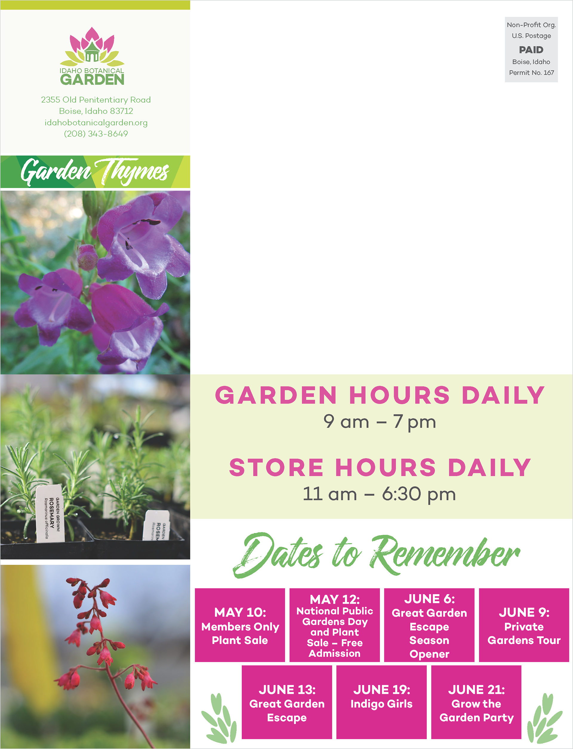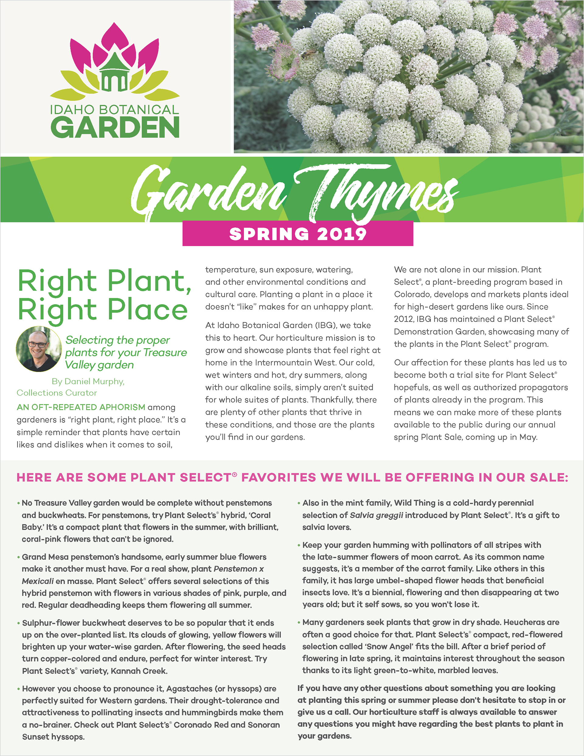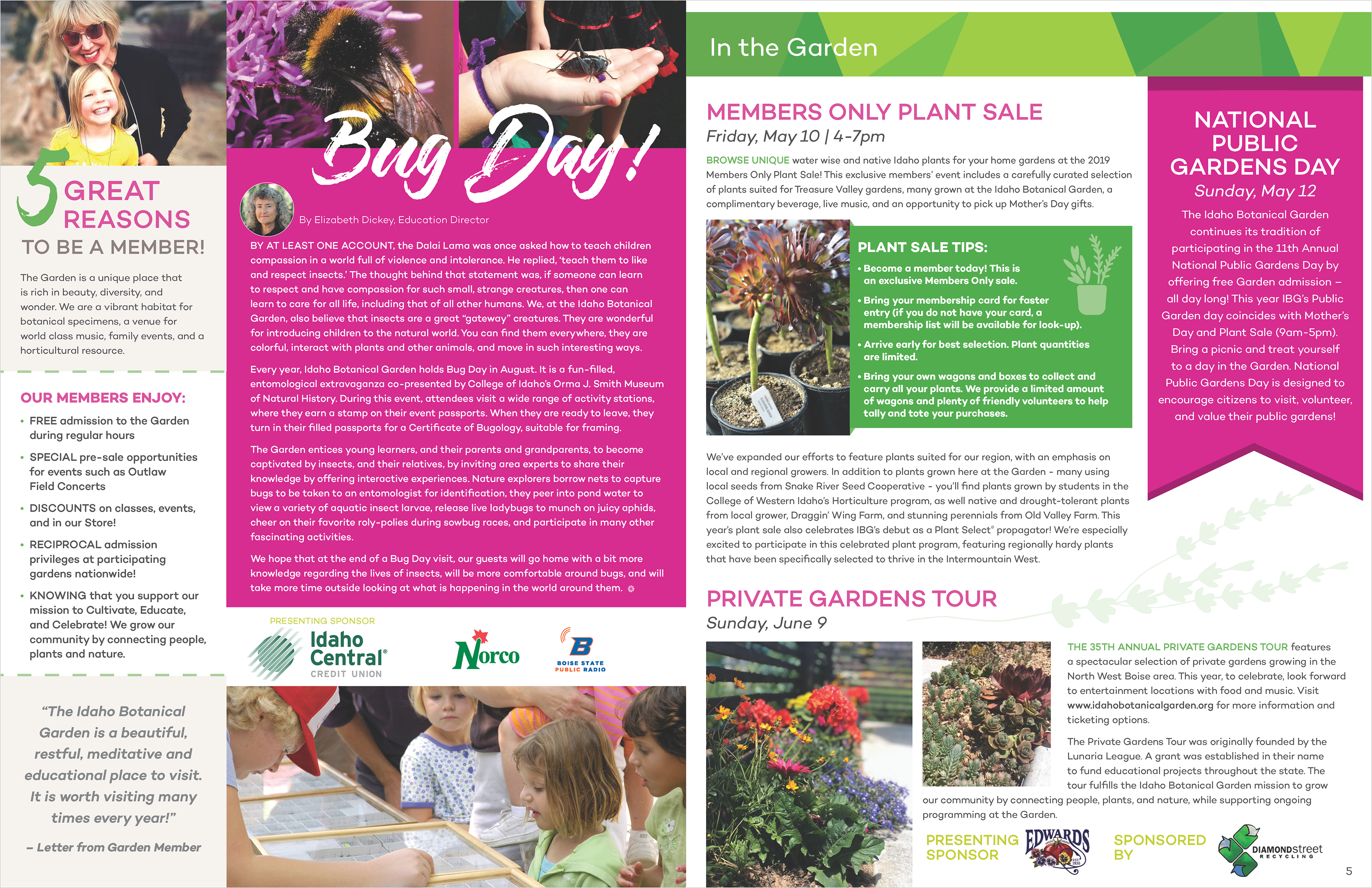 Spring 2019 newsletter layout for Idaho Botanical Garden patrons.