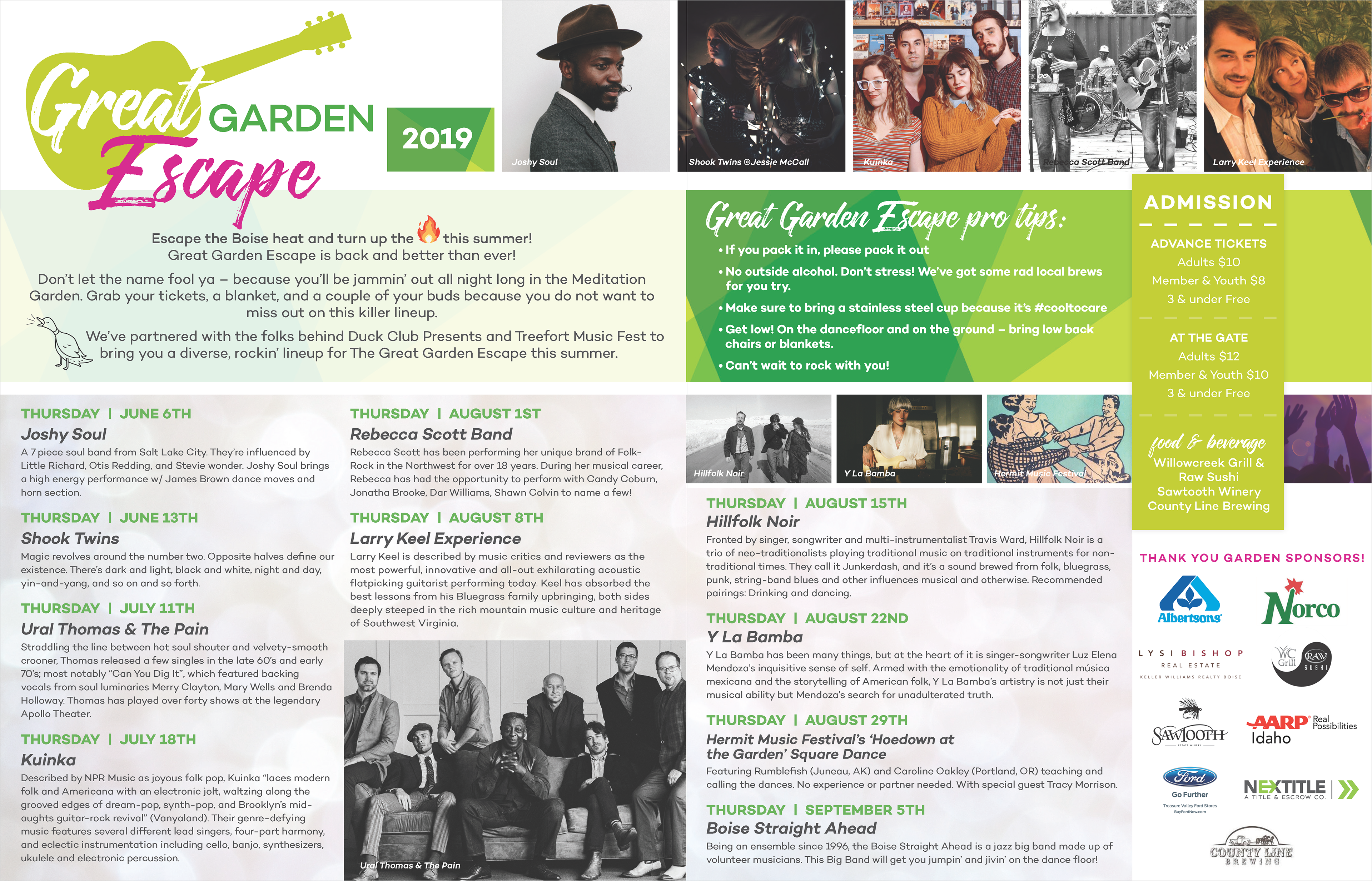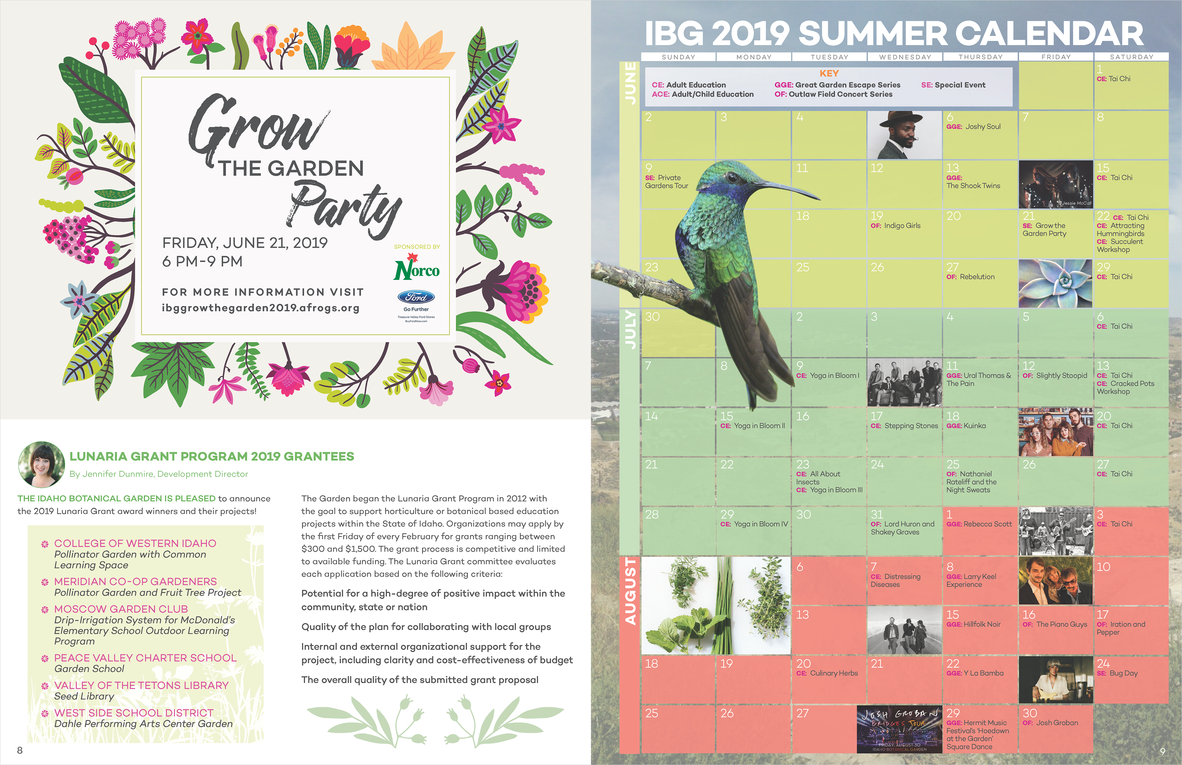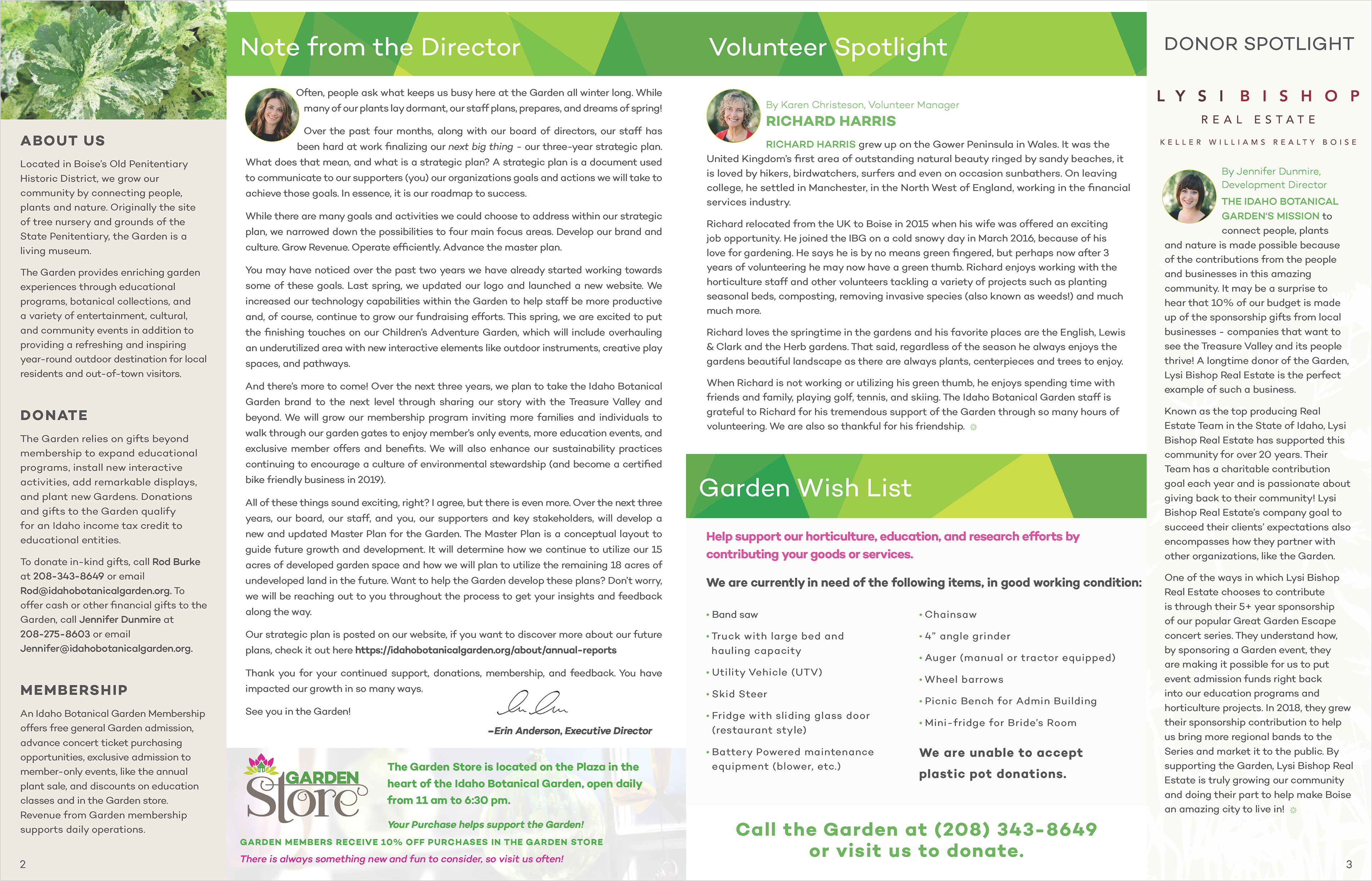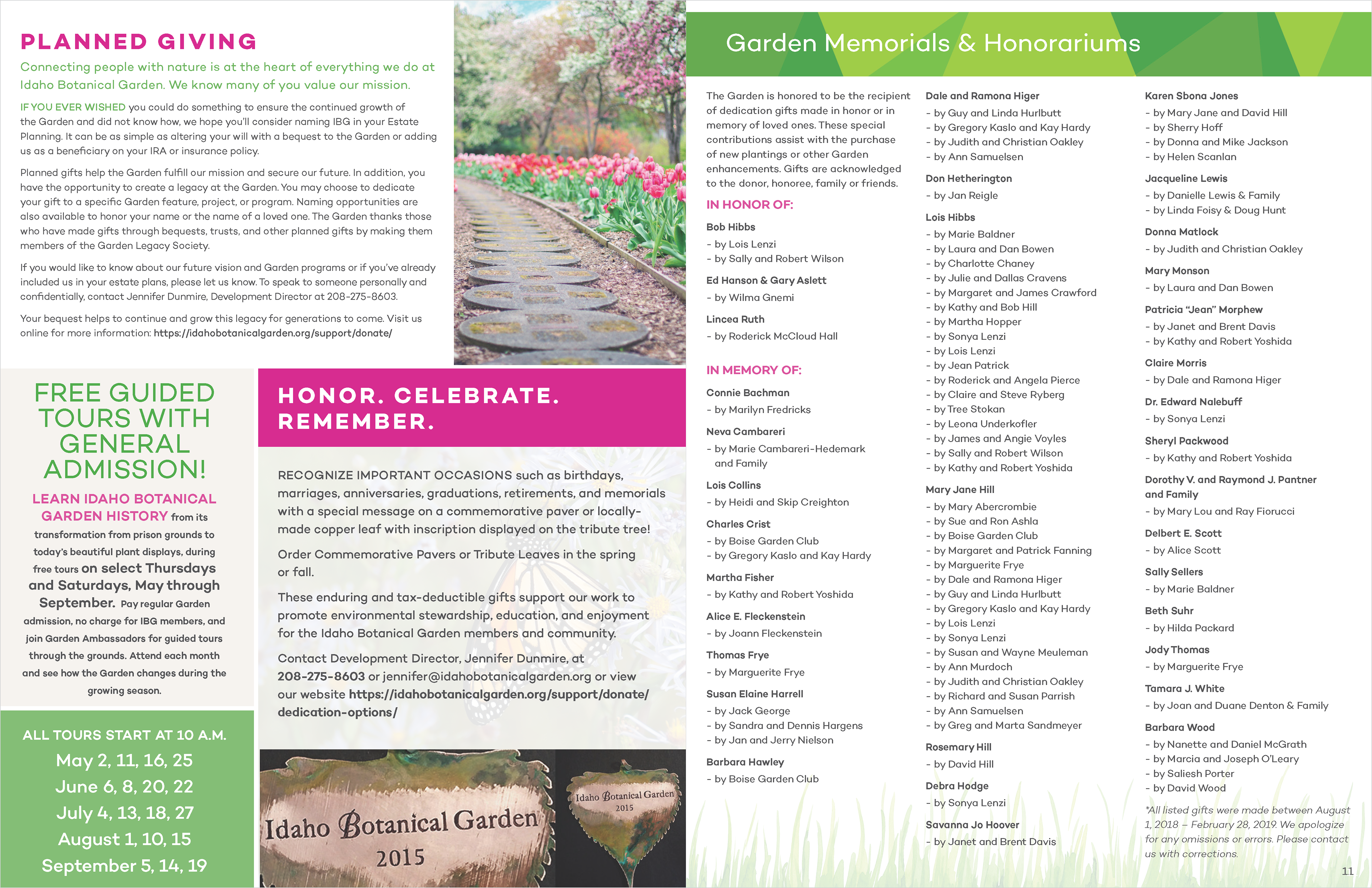 Spring 2019 newsletter layout for Idaho Botanical Garden patrons.