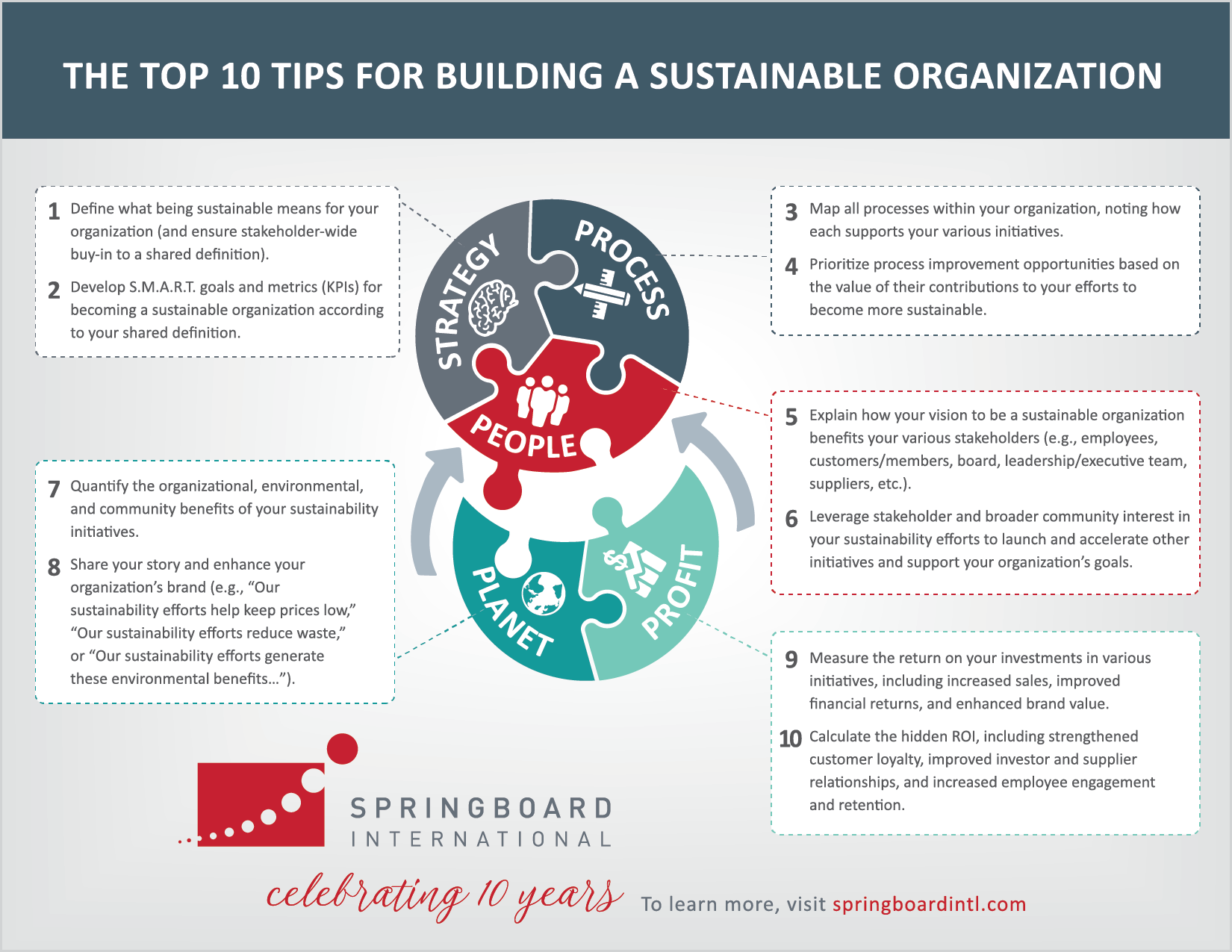 Flyer outlining Springboard International's Top 10 Tips for Building a Sustainable Organization.