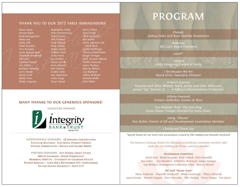Building the Dream is a yearly fundraising event that supports The Resource Exchange’s efforts. The Resource Exchange is a Colorado nonprofit specializing in improving quality of life for individuals with developmental disabilities. Pieces shown include Program/Schedule for the event, program insert, the event invite and complimentary bookmarks for the guests of the event.